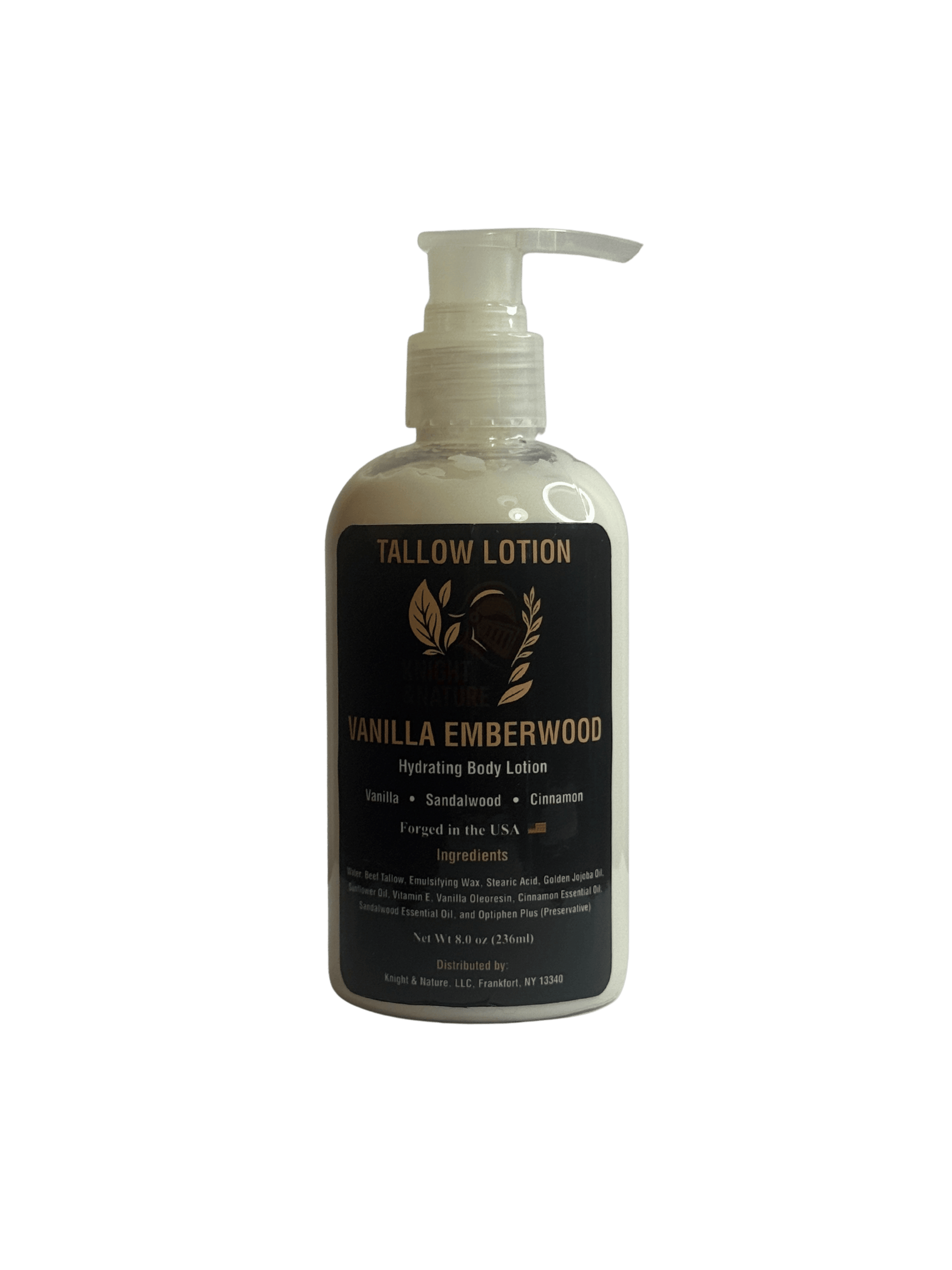 Water, Beef Tallow, Emulsifying Wax, Stearic Acid, Golden Jojoba Oil, Sunflower Oil, Vitamin E, Vanilla Oleoresin, Cinnamon Essential Oil, Sandalwood Essential Oil, Optiphen Plus (preservative)